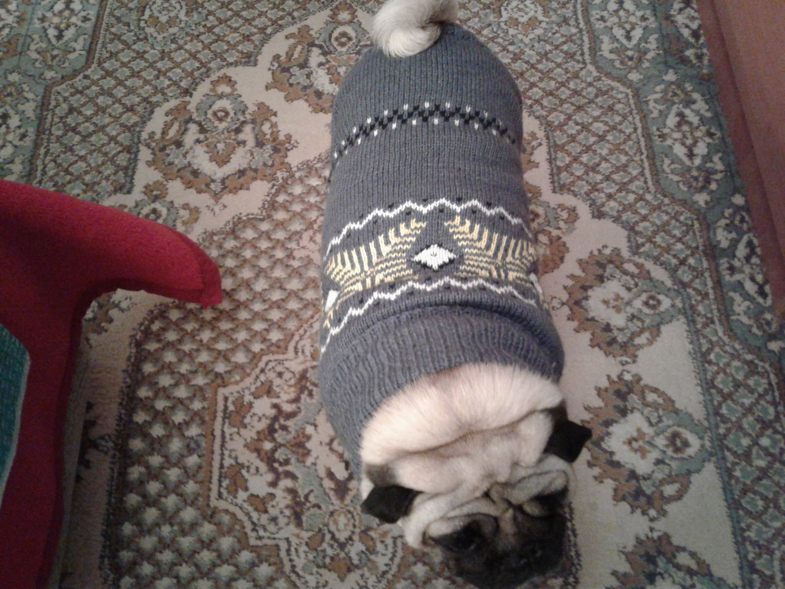 юлия николаевна, какой серьезный мужчина! :ki_ss: Свитер очень модный и Барику идёт, кстати, очень классно придумано, что можно на ушки натянуть, не будет дуть :co_ol: у нас тоже есть кофтейка, коричневая, досталась в наследство от бабушкиного таксона, Ачи любит кофты, больше чем комбезы, наверное, в них свободнее :-): здоровья вам!