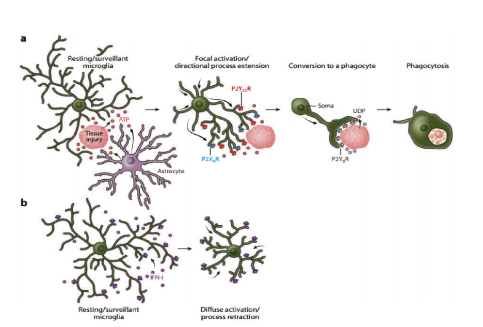 Для активации клеток хорошо подходит цитокин IFN-γ (гамма-интерферон). Кроме того, после этого микроглия высвобождает большое количество IFN-γ во внеклеточное пространство. Это «возбуждает» ещё больше микроглиоцитов и запускает активированный цитокином каскад, незамедлительно запускающий вообще все находящиеся поблизости микроглиоциты.