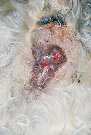 Фото 1. Опухоли перианальных желез у собак. Удлиненная, имеющая ножку, опухоль в перианальной области у пожилого коккера спаниеля.