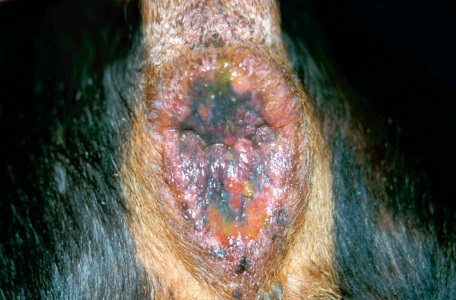 Фото 2. Опухоли перианальных желез у собак. Изьязвленный узел в перианальной области у пожилого коккер спаниеля.
