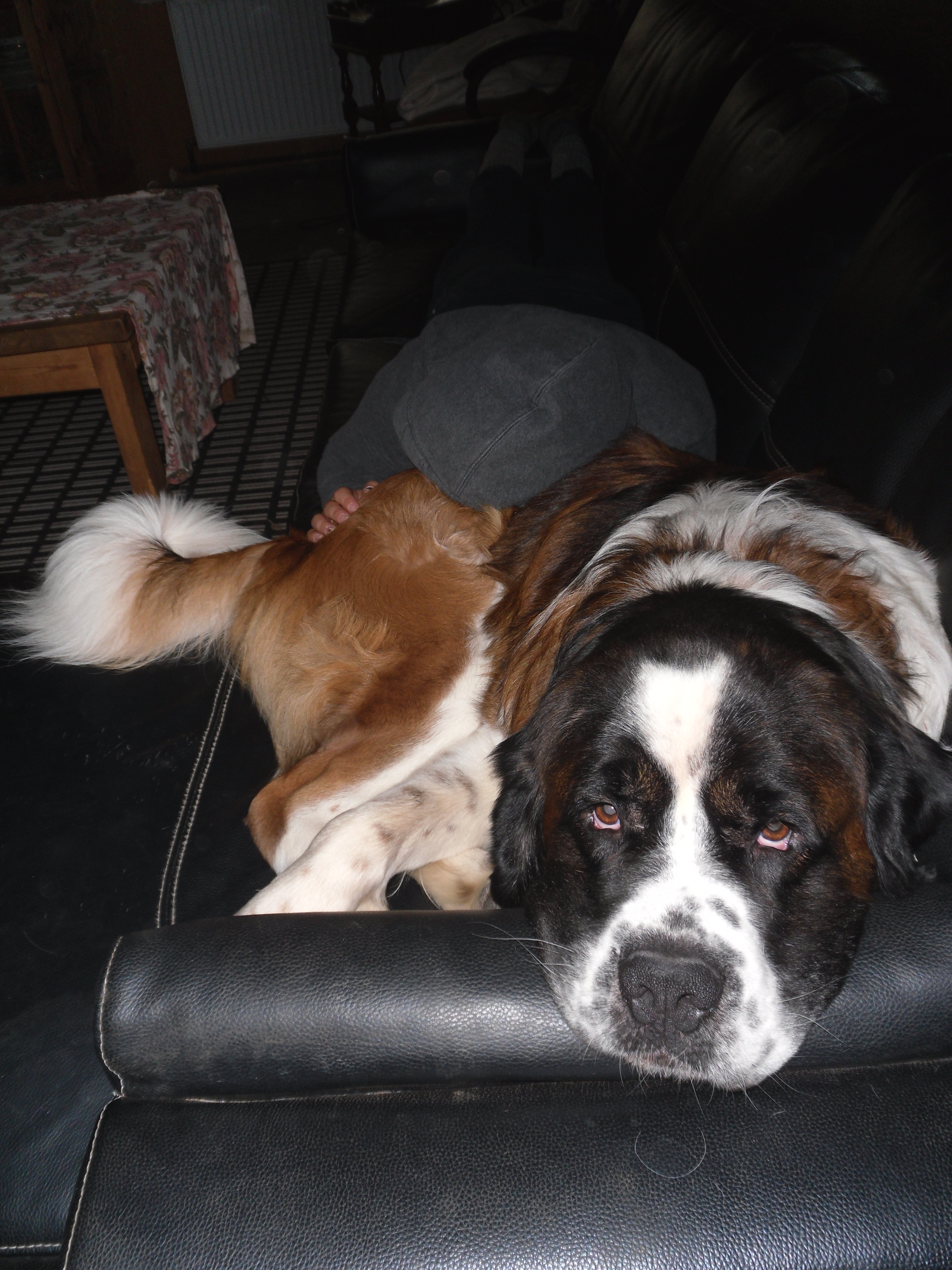 Сенбернар, 2,5 года, 67 кг, зовут Маленький Бетховен (далее-Бетховен), глухой-то ли с рождения, то ли нет-не знаю, в 7 недель вет по баэрн тесту определил. Поэтому мы его и взяли, ибо семья, зарезервировавшая его, от него отказалась. Все понятно-первая собака, сен, и вдруг глухая. В общем, чувак попал к нам с диким циститом и моторчиком в заднице.