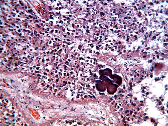 Благодаря наличию фосфорнокислого кальция, песчинки первично флуоресцируют в ультрафиолетовых лучах как и капельки коллоида голубовато-белым свечением. Подобную же голубую флуоресценцию дают миелиновые оболочки нервных стволов.