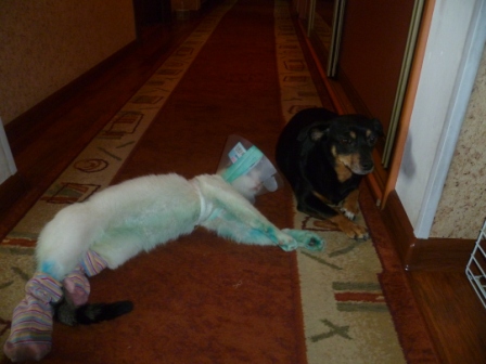 И вот как выглядят наши лапки сейчас.Скоро на повторную операцию и косточки,которые торчат, спрячут.