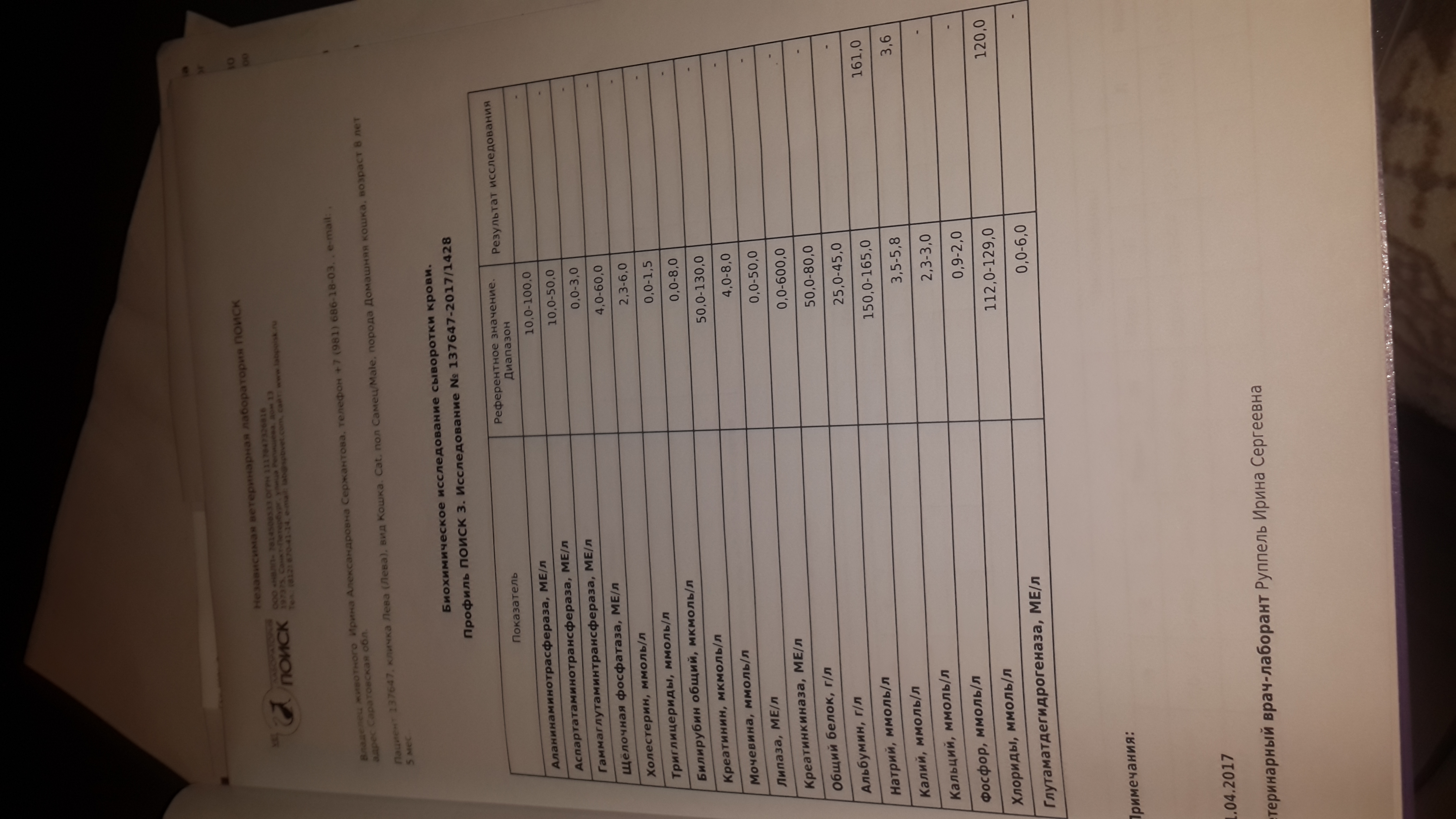 14 говорите на анализ..угу...я конечно не знаю где вы решите делать анализы но общий и биохимический анализы должны быть полными - общий необходим чтобы понимать на сколько сил у кота хватить - гемоглобин, лейкоциты, и т.д.,СОЭ, а в биохимии обязательно белок, креатинин, мочевина, щелочная фосфастаза, АЛТ, АСТ...не лишним будет биллорубин..фосфор. И анализы на вирусы, Токсоплазмоз, Короновирус – который вызывает поражение кишечник, а также может вызывать ВПК (FIP) или вирусный перетонит кошек. Вирус лейкоза кошек – вызывает опухоли и иммунодефицит. Вирус иммунодефицита кошек (аналог ВИЧ) – вызывает СПИД у кошек. Ну и разумеется вирус бешенства. Все эти вирусы наиболее часто встречаются у кошек и являются самыми, пожалуй, опасными для их жизни и здоровья. Все они, кроме вируса бешенства, безопасны для человека. И вот тогда можно говорить что с котом...а по тем анализам что у вас...я даже слов цензурных подобрать не могу если честно, простите еще раз...