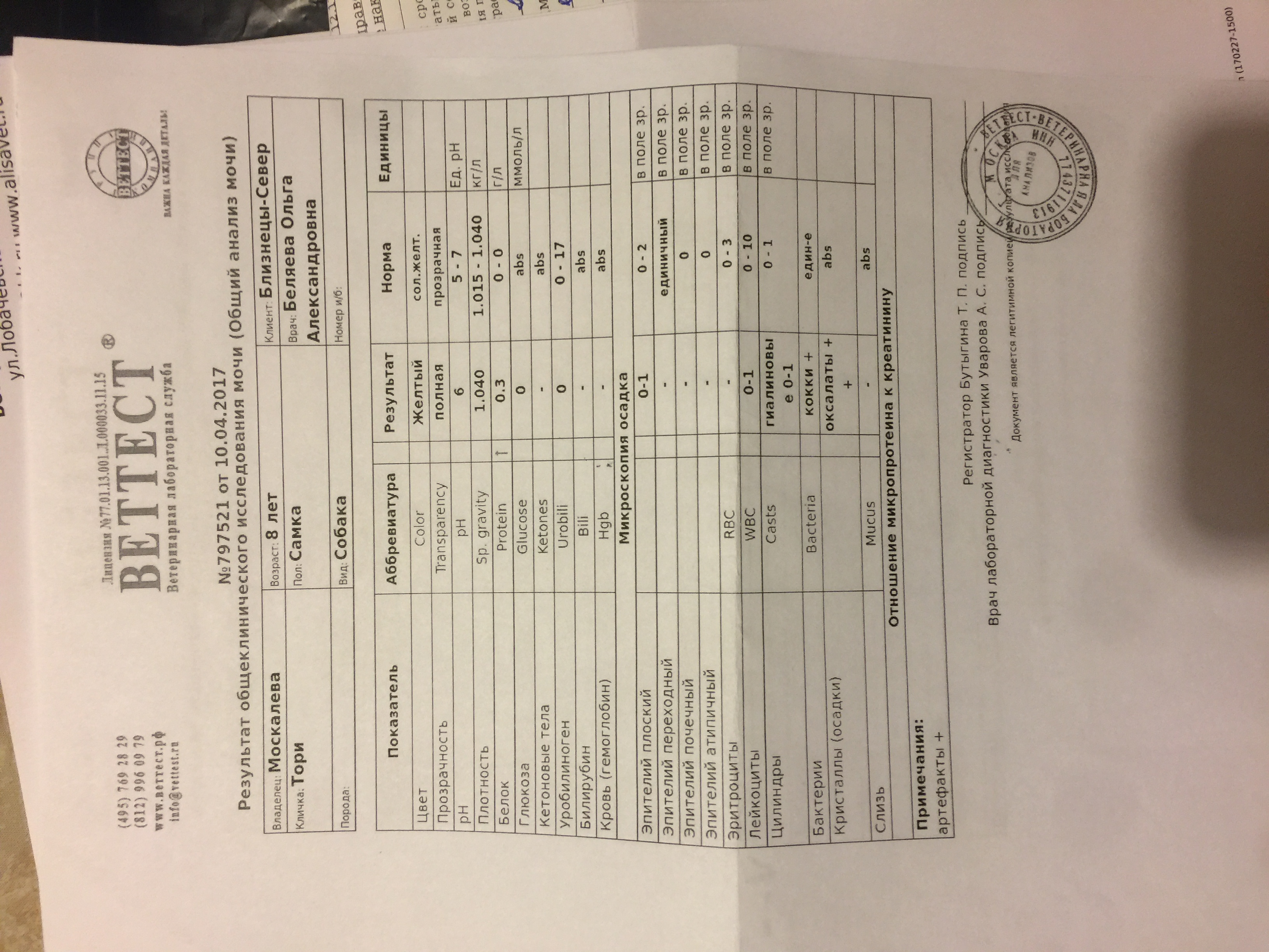 На утро побежали сдавать анализы, но окащывается, что сдавать их надо только на голодный желудок! И попросили собрать ещё и мочу. Днём ничего не предвещало, как говориться! Собака всё так же игривая, сводит с ума кота, бегает с мячом, аппетит хороший. На следующий день сдали анализы (мочу, общий анализ крови и биохимию). На следующий день получили результаты и, как сказали врачи, идеальные!