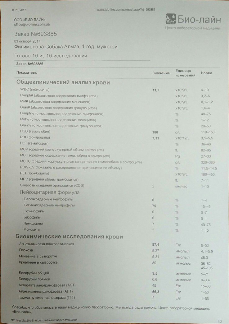 Можно попробовать зарегистрироваться на сайте клиники Белый Клык и попробовать выложить результаты анализов там..веты прокомментируют.