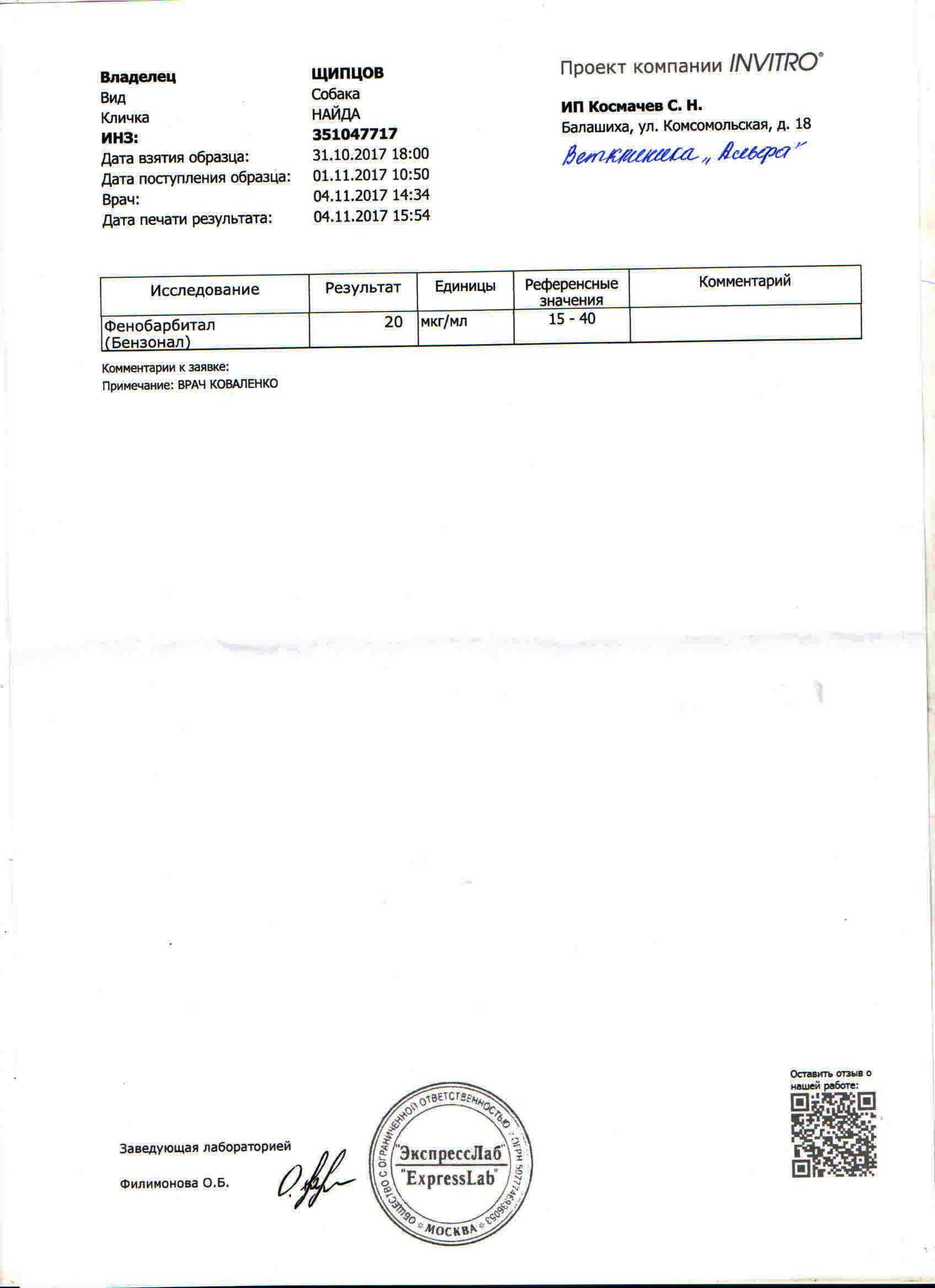 Анжела ,спасибо .Я звонила в лабораторию ,они сказали,что все правильно ,это такая форма у низ,в бензонале есть это вещество тоже,поэтому они делают двойное значение,а у нас только фенобарбитал.Отправила своему врачу в Скрябинку и еще одному врачу буду ждать ответа от них.