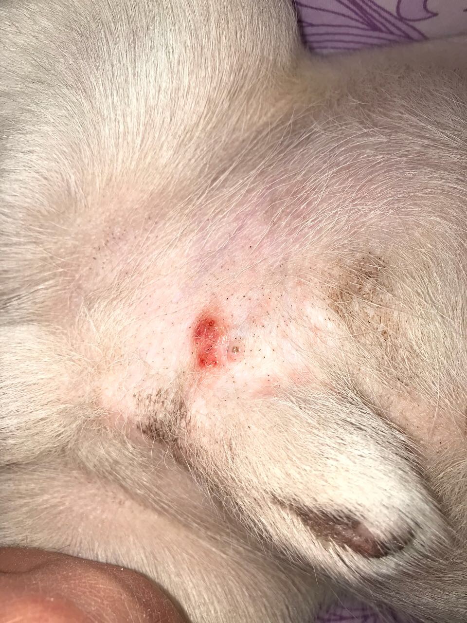 Здравствуйте! Чихуахуа, почти 7 лет, мальчик.. с 23 декабря пьём паглюферал-1 (1/6 2 раза в день) карсил (1/4 2 раза в день) и капилар 1/8 (2 раза в день) едим роял канин гепатик уже много лет ( проблемы с печенью) вот недавно сначала заметила какой-то прыщик у него рядом с причинным местом, а сегодня нализал до вот такого состояния. Я очень переживаю... что это? Аллергия? Может ли она через месяц после приема таблеток вылести? Что делать?.... боюсь еще сильнее расчешит, завтра один дома