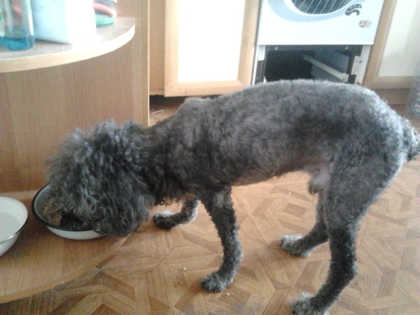 Вот так сейчас Тоша кушает. Мать обкромсала кое-как, на голову ножниц не хватило, затупились. Ну и ладно, зато легко ухаживать. Вчера и сегодня Тоша по-моему сам не верит своему счастью: ходит по квартире, нарезает круги, устанет, остановится и отдыхает стоя, на попу не усадить.