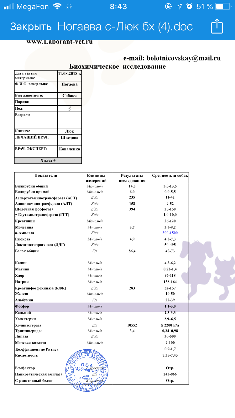 Анжел, я к Дубовицкой аж за месяц с чем-то записалась.. Хохлов мне написал, что с болезнями печени-это уже не к нему..;( я уверенна, это всё паглюферал.... В ветеринарке, что рядом с домом-это всё бесполезно, там с эпилепсией вообще не знакомы.. надо паглюферал убирать, причем срочно, а я не знаю как.. последние 2 дня прям вода, а не понос даже;( кушает нормально.... может можно дозу уменьшать? В общем.. что то я в шоке.. и не знаю, что делать эти 1,5 недели