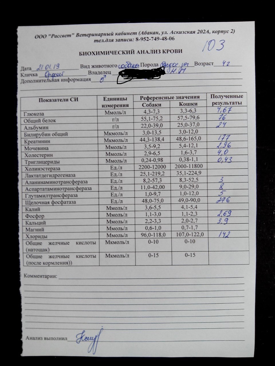 Никита ,плохо ,что не писает,это почки,у Вас повышен креатинин ,не критически ,но есть и фосфор больше нормы.У меня у первого ротвейлера так было ,но мы на креатинине за 200 жили лет пять.Давали чтобы убрать фосфор ипакетине порошок,для снятия давления в почках энап 5 мг,два раза в день,хофитол,если не ошибаюсь и кетостерил-это нам уролог назначала.И конечно надо в ветклинику на капельницы,если найду наши назначения завтра напишу ,что делали в капельницах.Попробуйте нажать с боков на мочевой пузырь.Щелочная фосфатаза у Вас небольшая.А он у Вас когда ходит горбится и еле встает??
