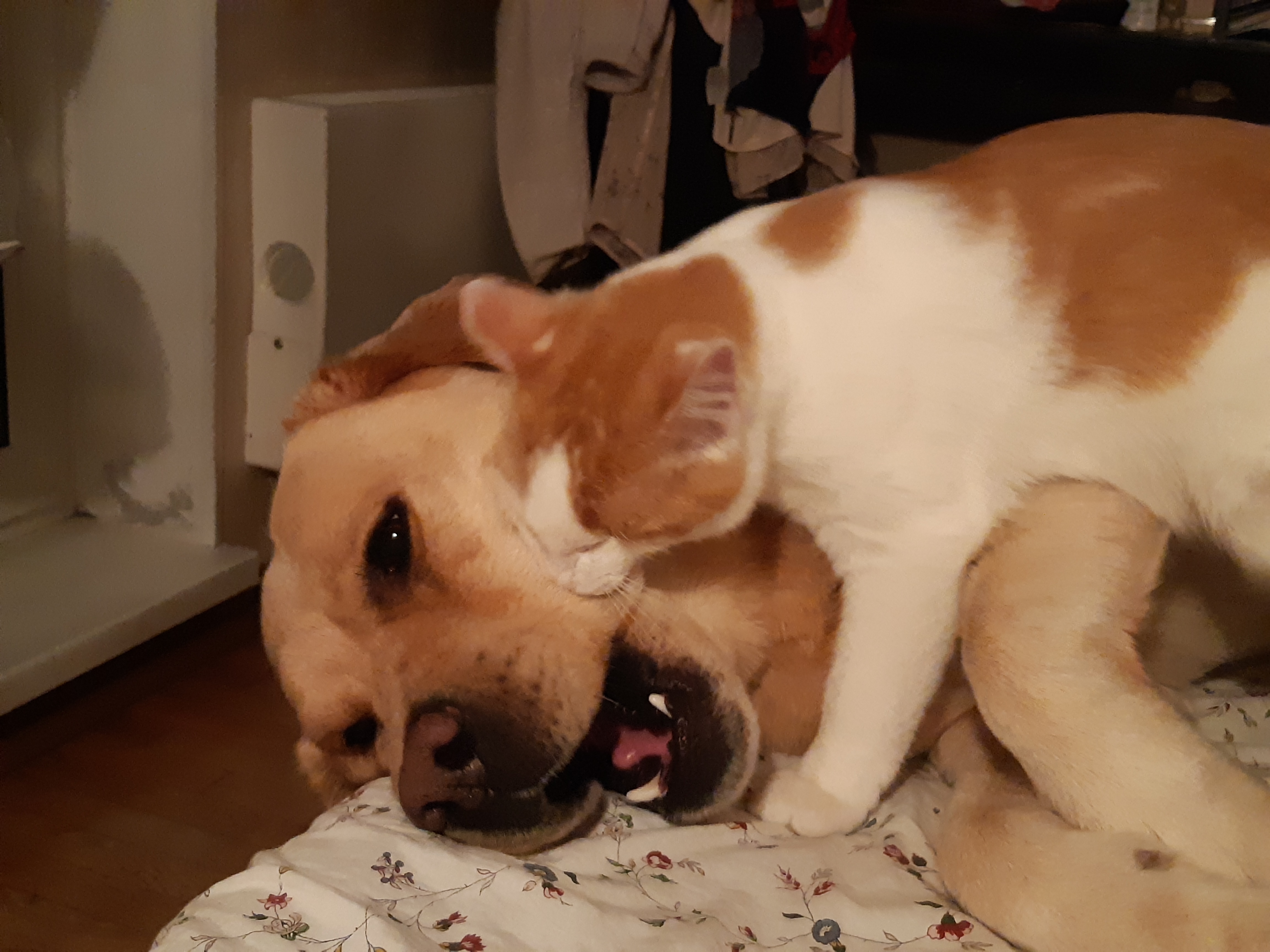кота Бориску. Так они забавно возятся, просто наслаждение наблюдать за ними