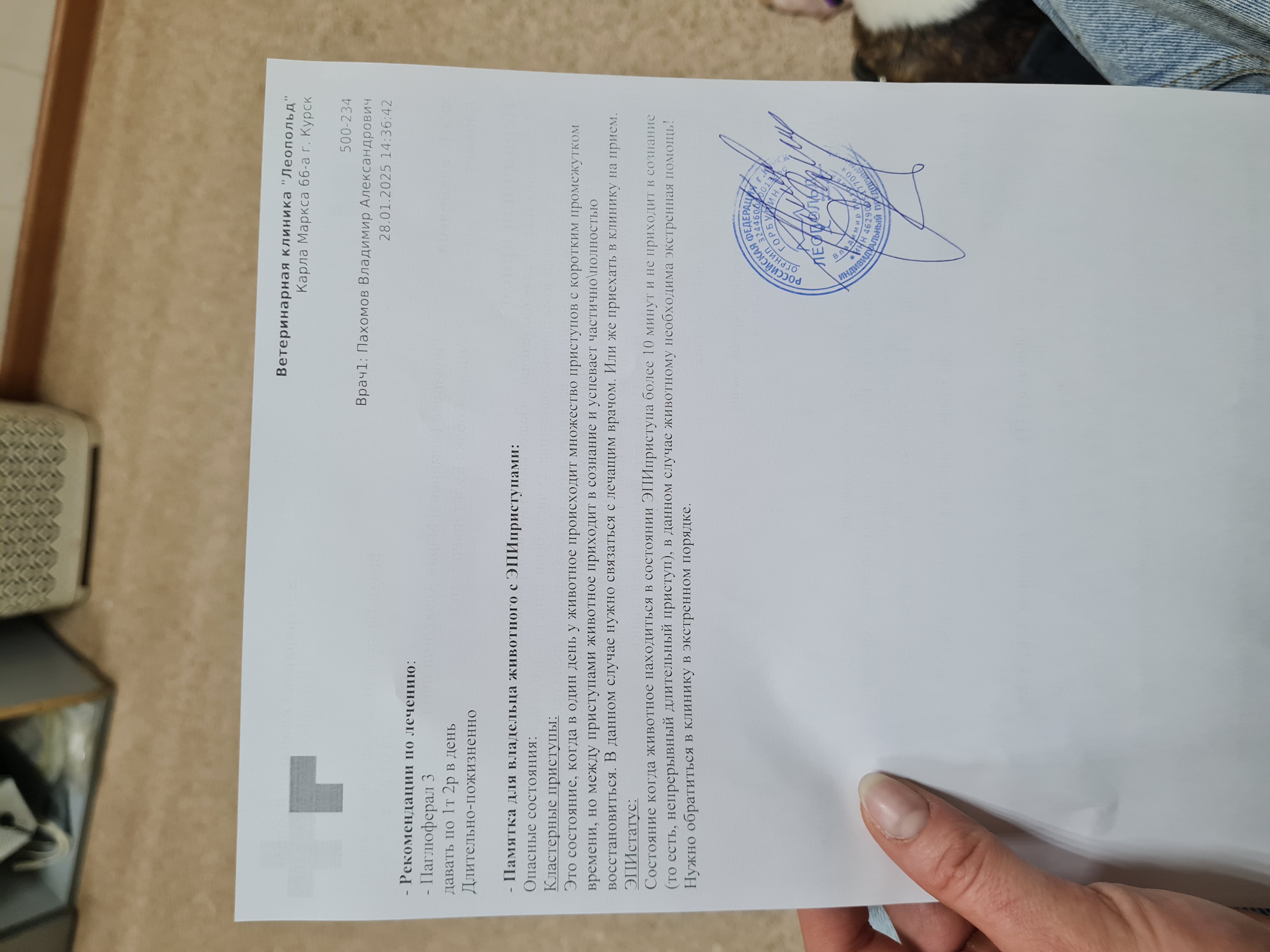 Днём поехали к неврологу. Врач расспросила нас, провела осмотр собаки, прощупала её. Сказала что собака в хорошем состоянии. Дальше сказала что так как приступ был только один, это не может считаться эпилепсией, только если приступы начнут повторяться чаще чем один раз в пол года. Поэтому никакого лечения предложить пока не может. На случай если приступ повторится, выдала рецепт на два лекарства, которые надо дать после повторения и после уже записаться на второй приём для дальнейшего лечения.