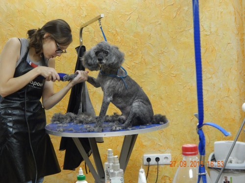 По опыту прошлых посещений Тоша плохо себя вел в моем присутствии, поэтому в этот раз я осталась в зале ожидания, посмотрела новинки, почитала журналы. Тоша на удивление спокойно ушел с Таней, процедуры по-моему очень понравились. Был слышен только шум воды, жужжание фена, да тихий голос Тани, она всё время о чем-то с Тошей разговаривала. Надо сказать, что Танечка-грумер тоже волонтер ещё со школьной скамьи. Мы, взрослые, просто диву давались, как девчушка-девятиклассница управляется с серьезными собаками, стафами и питами, при чем не домашними воспитанными, а подобрашками с неизвестным прошлым. Я тихонько заглядывала к ним, чтобы сделать несколько снимков.Натэлла писал(а): Как проходили процедуры?