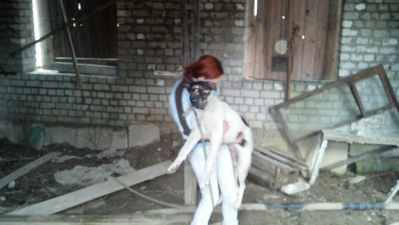 Вот... А теперь вернусь немного назад, когда меня дергало в ожидании звонка мамы... Чтобы отвлечься от судьбы несчастного животного, я решила....заняться кем-то более несчастным :-) Увидела в группе волонтеров сообщение, что требуется транспортировка собаки-подмашинницы в клинику. Я с какого то перепугу нарядилась в белые джинсы и куртку, взяла поводок-ошейник-намордник и мы поехали. Собака оказалась чуть больших размеров, чем я ожидала и в не очень плачевном состоянии. Я минут 10 преследовала ее, и она забралась в заброшенный дом. Окна там забиты, муж бы не пролез, так что я продолжила геройствовать. Собаня забилась в угол и начала на меня рычать.