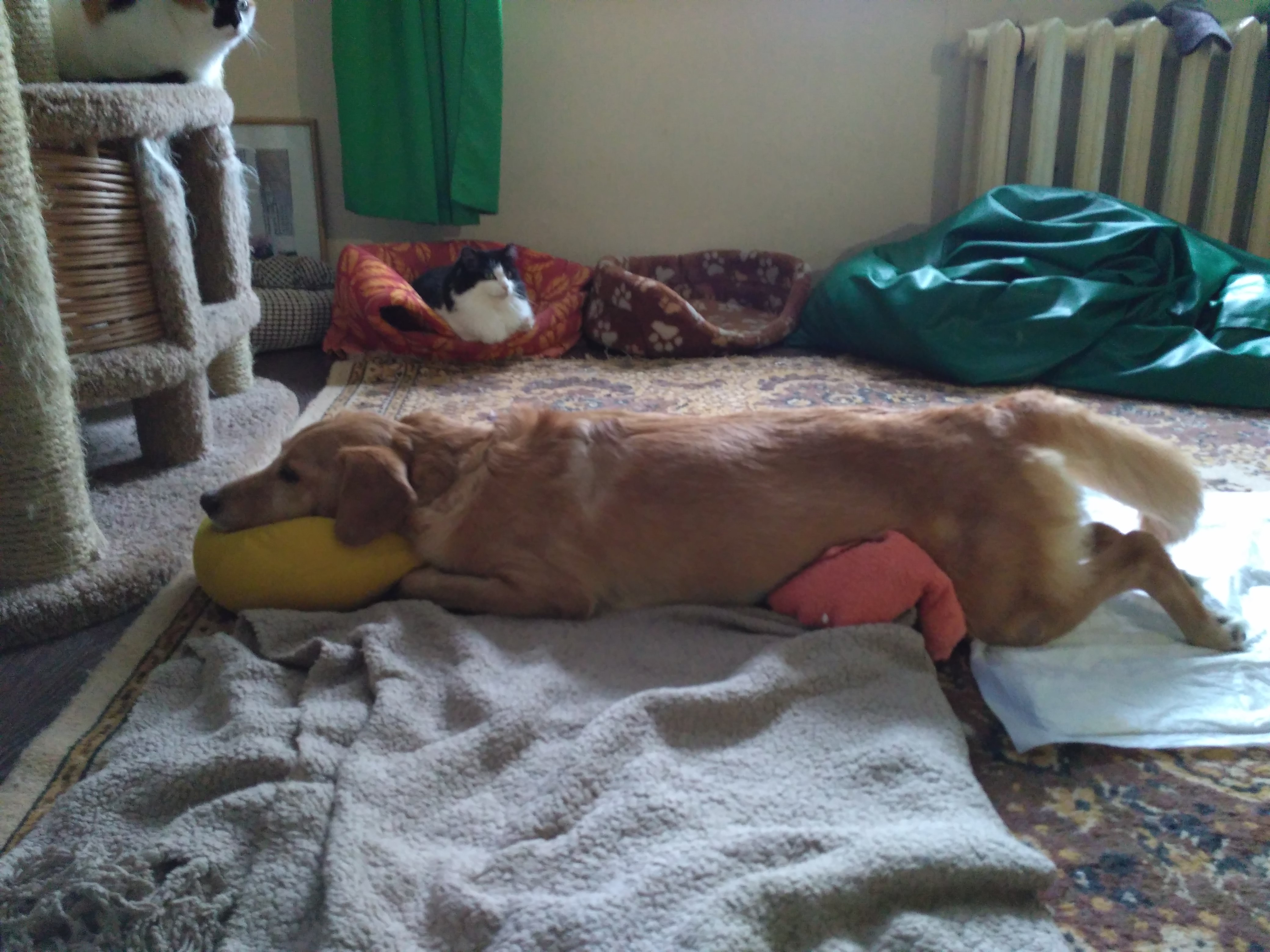 Глазки перед собой видят плохо, обзорно нормально. Миску свою сразу понимает, когда несу. Наталья сказала дозировки понижать, вот мы этим занимаемся. Что не встаёт - плохо конечно, что тут скажешь...