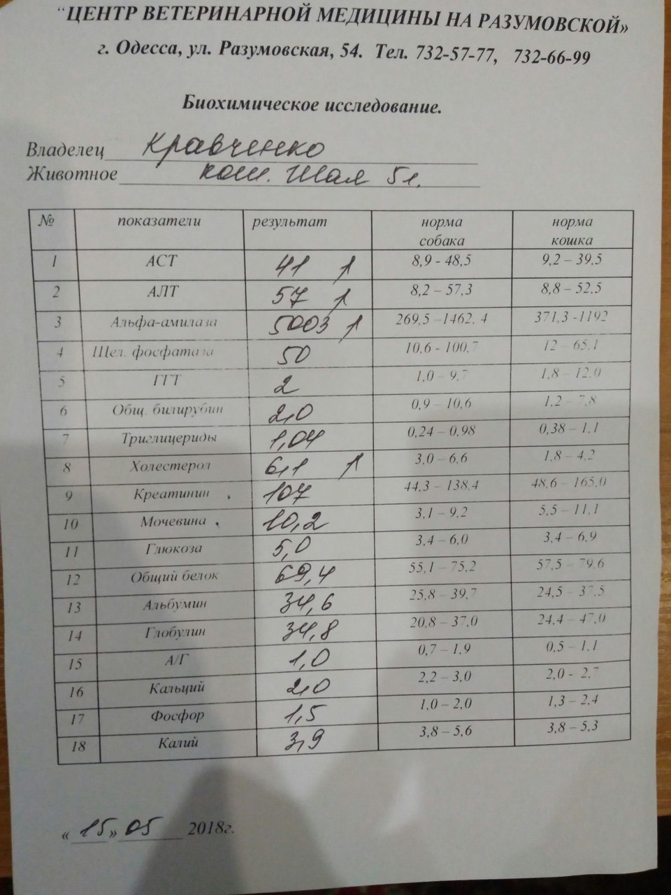 У меня есть кошка Шая, ей 5 лет и один месяц, мама у нее русская голубая, папа неизвестно кто, взяли ее в месячном возрасте. Кастрирована. Кошка ест Роял Канин индор сухой корм и Роял Канин пауч для чувствительного пищеварения, весит 4, 700. Стул раз в сутки, писает до 4 раз в сутки. Есть прививки от бешенства и комплексная от вирусов. Кошка домашняя, могу на шлейке вывести ее на 10 минут во двор раз в 2-3 месяца.А теперь к страшному. 17 апреля я пришла с работы и обнаружила на кровати лужу мочи. Поскольку моя девочка всегда писает в лоток я была очень удивлена такой находке, но никаких действий я не предприняла, Шая была игривой и злой - как всегда, поведение никак не отличалось от обычного. Об этом досадном недоразумении мы быстро забыли. до 14 мая у нее все было хорошо, но вечером случился мой персональный ад. 14 мая в 23.30 Шая спала в своей коробочке, затем ее резко затрясло, она выбежала с коробки,завалилась на бок, ее трясло, лапки дергались как при беге, но как-то хаотично, со рта пошла пена, усы дрожали,я придавила ее к полу, потому что она хотела бежать. Я не буду описывать свои чувства, думаю, что всем тут они знакомы. Длилось это 1.5 или 2 минуты. Я выбежала с ней на улицу и мы поехали в больницу. Врач осмотрел ее, дал укол "общеукрепляющего" препарата. Назначил УЗИ, ОАК, биохимию,ЭКГ. Когда мы были дома приступ повторился в 5 утра, она спала со мной, ее затрясло, она упала с кровати и произошло тоже само что и в первый раз+ она описалась. Мне показалось, что второй приступ был короче, чем первый. Затем Шая лежала пару минут, потом ходила по квартире и все рассматривала. Немного поела и попила водички. Около 12 дня 15 мая мы сдали ОАК и биохимию, результаты прилагаю. Я не знаю куда мне двигаться дальше, консультировалась у 3 ветов, первый сказал, что есть отклонения со стороны печени и поджелудочной по анализам, назначил креон 2 раза в день и диетический корм Роял - это и даем. Предположил, что кошка так могла среагировать на печеночную колику. Сказал наблюдать. Второй врач сказал сразу делать МРТ, мол по анализам относительно нормальная и здоровая кошка, если по МРТ все ок, значит эпилепсия. Я боюсь делать МРТ, я боюсь делать ей наркоз. Третий доктор сказал делать абсолютно все анализы+МРТ и тогда можно о чем-то говорить. После второго приступа, когда она пописала я поняла, что 17 апреля был самый первый приступ, т.е. в общем их было 3. После 14 мая я стала плохо соображать, я постоянно боюсь, что это может повториться, вскакиваю ночью от каждого шороха, я прошу помочь мне. Я не знаю что делать, посоветуйте в каком направлении мне двигаться. Это моя душа. Спасибо всем, кто прочитал это, я очень надеюсь прояснить для себя происходящее и принять верное решение.