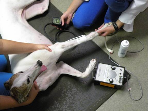 Измерение кровяного давления у псов ничем не отличается от такового в случае с человеком. Надувная манжета надевается на лапу или хвост собаки, после чего врач проводит стандартную процедуру. Здесь важно помнить, что животные в этот момент обычно сильно пугаются, а потому точное значение артериального давления удается получить только раза с пятого.
