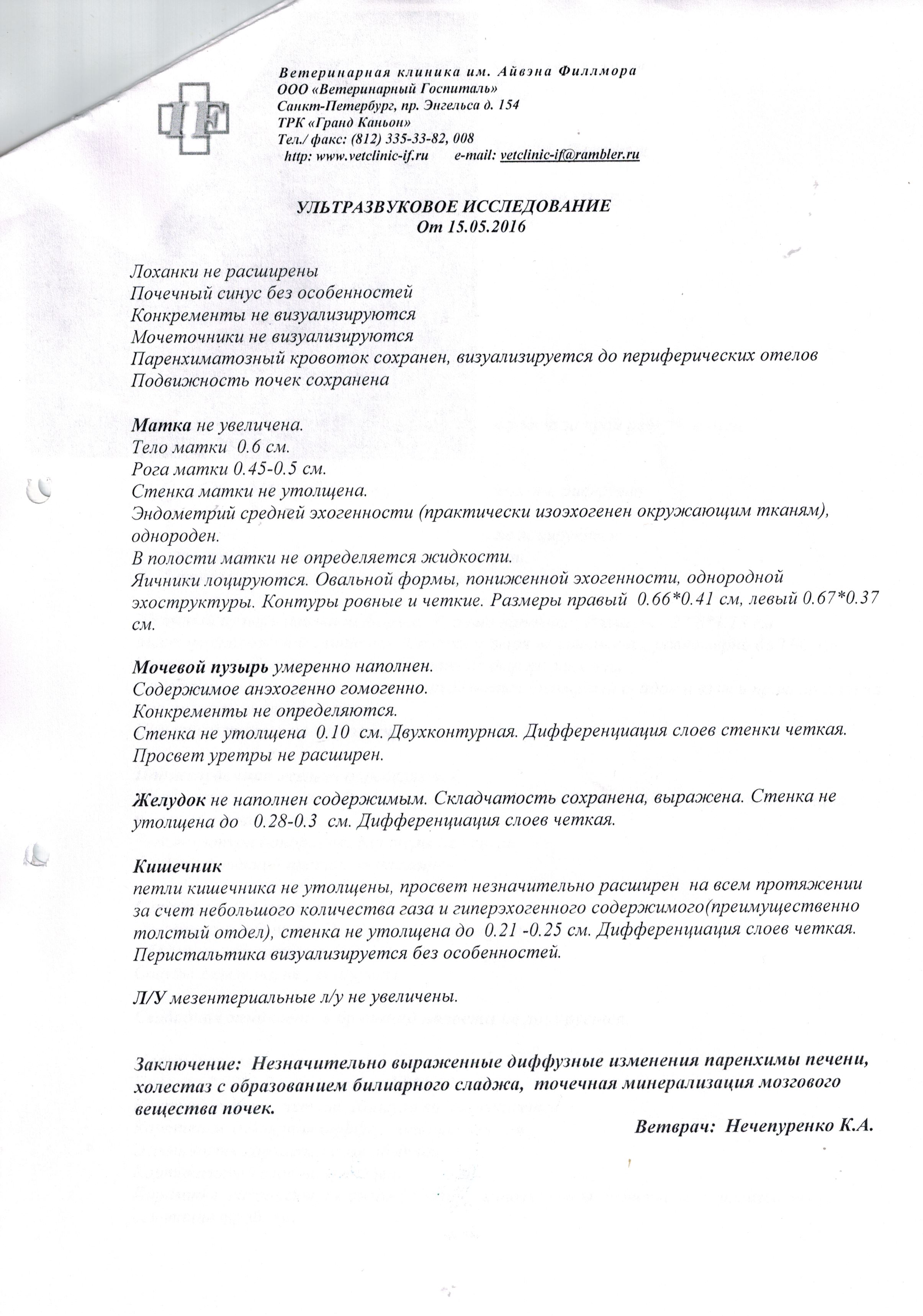 По результатам МРТ. Никаких рекомендаций кроме как: приезжайте если вам будет плохо. К тому же в моем обращении они как бы информацию записали не совсем верно. Вообще заметила за ветеринарами, что они вопросов половину не задают. Например: кашляет ли соба? и отмечают, что не кашляет. А она у меня на момент обращения кашляла, но я забыла об этом сказать. Вобщем, я записываю теперь что меня настораживает, чтобы потом не забыть сообщить врачу.
