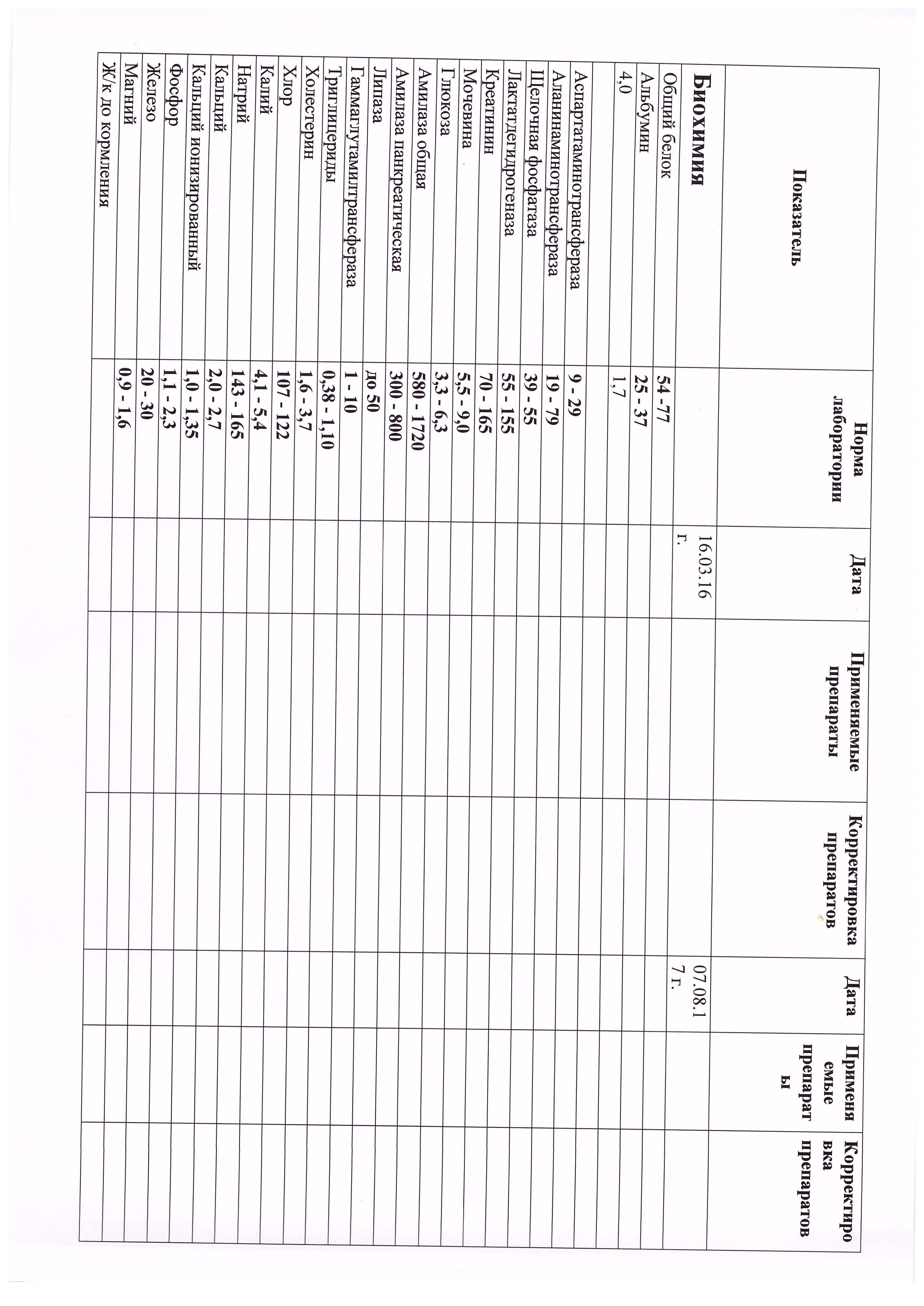 . В свое время наш Владимиров оценил это мною введение ))) Просто было удобно смотреть в динамике по числам было так: получили анализ - перед анализом давали препараты - то-то, получили вот такую картину, новое назначение - пропили пересдали - получили то-то (биохимия, общий, фенабарбитал, моча, кал) в моей таблице нормы лаборатории Зоовета ДЛЯ КОШЕК (понятное дело надо менять под свою животинку и нормы своей лабы). Если кому приглянулась табличка, то пишите мне на почту Rodnaya71@yandex.ru в теме пишите : ДАЙ ТАБЛИЦУ