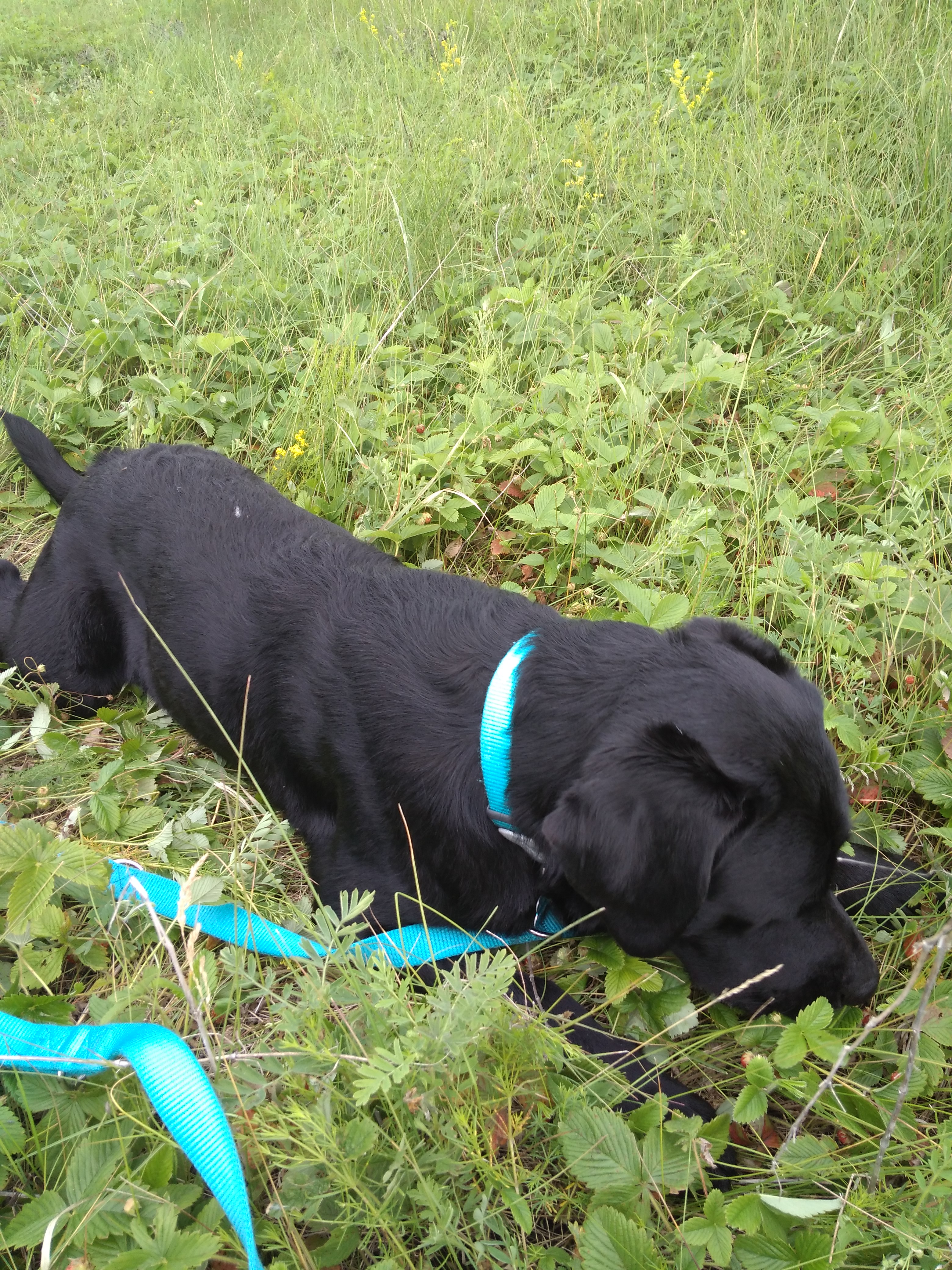 Первый блин был комом - рвал ягоду прям с листиками и ветками. Спустя какое-то время до него дошло, что надо выбирать спелую ягодку. Искал так: зарывался носом в кустик, шумно нюхал, потом не менее шумно чавкал. После того как наелся, уже просто валялся на земляничной полянке.