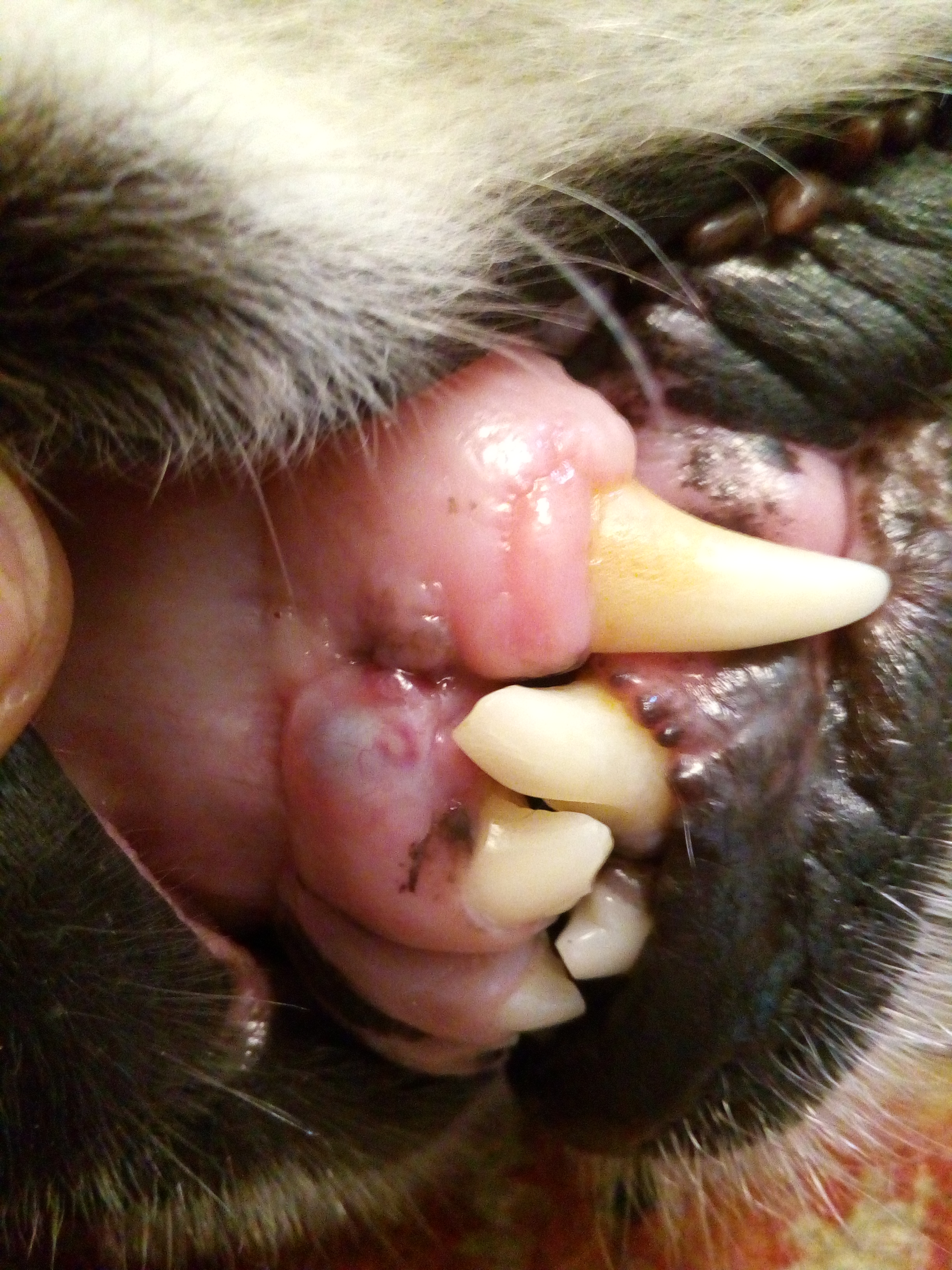 Девочки, пишу, свинья такая...Это я про себя. Наша история началась так: весной я чисто случайно обнаружила у геры образование на десне как нарост на верхней десне над клыком и в сторону жевательных зубов. Я конечно же перепугалась и почему то поперлась к ветеринару хирургу-стоматологу ( тупая же, РОТ, ЗНАЧИТ СТОМАТОЛОГ). Он посмотрел, пощупал, сказал, что это сто процентов не рак. Я давольная(врач же сказал, успакоилась и поперла домой мазать мазьками.