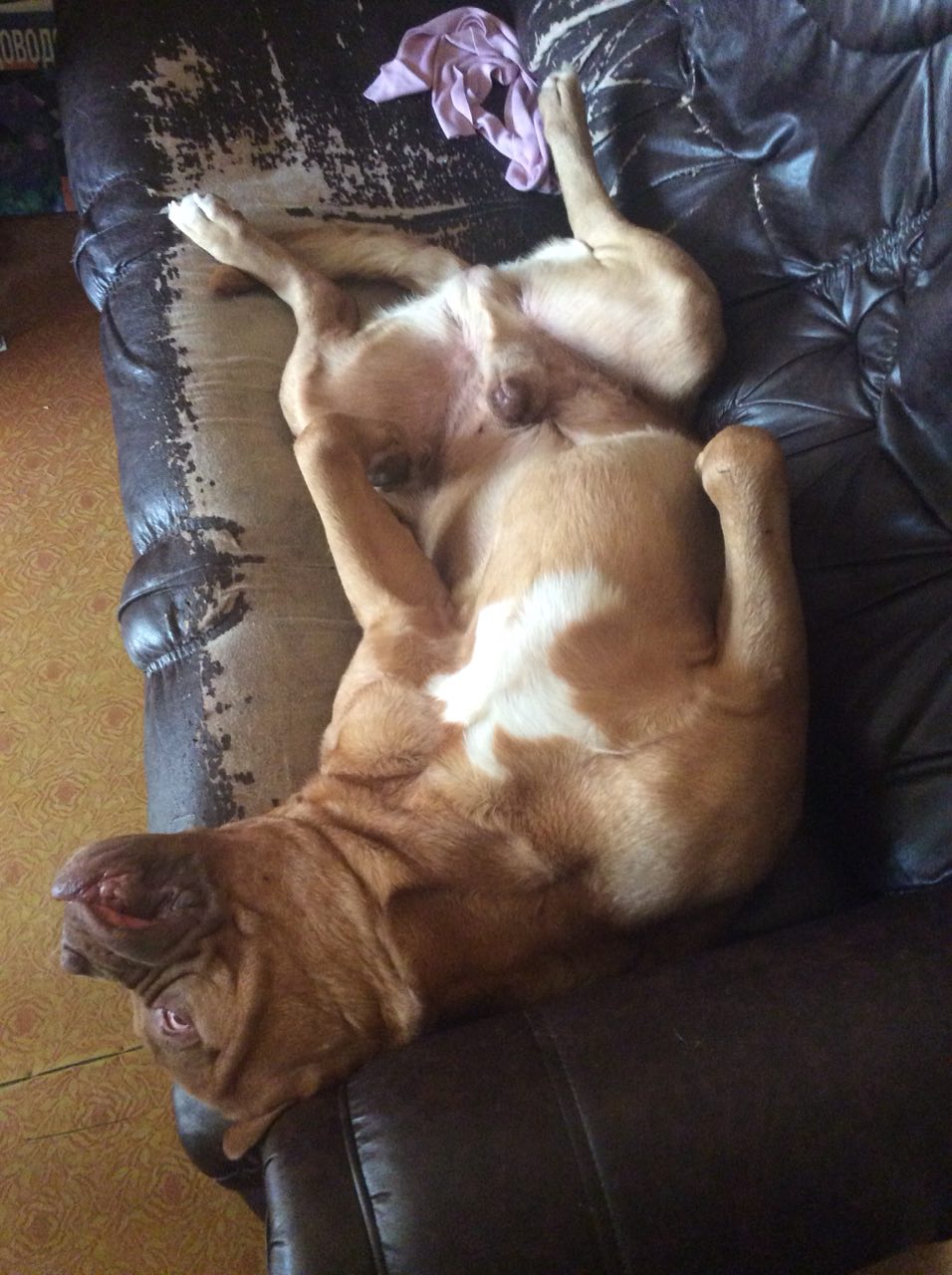 Вот такую картину сейчас наблюдаю, 8й час после последнего приступа. Как-то читал статью про фазы сна у собак, это ведь можно считать хорошим сигналом (пардон за диван, это его любимое место для сна и он иногда на него с разбегу прыгает, ободрал все)?